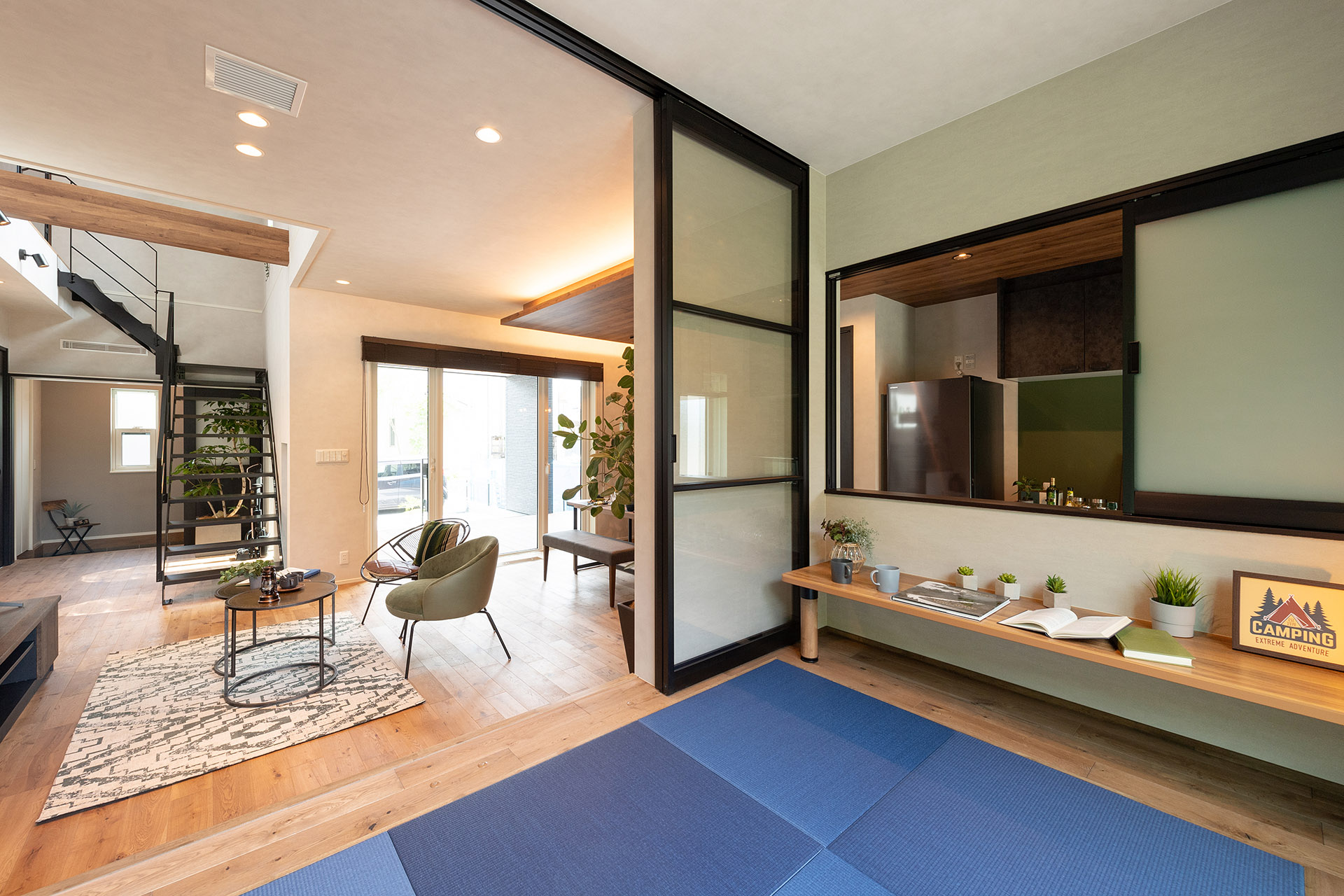 和歌山モデルハウス/リビング/和室(床下収納付き)/吹き抜け/ガラス引戸(閉)