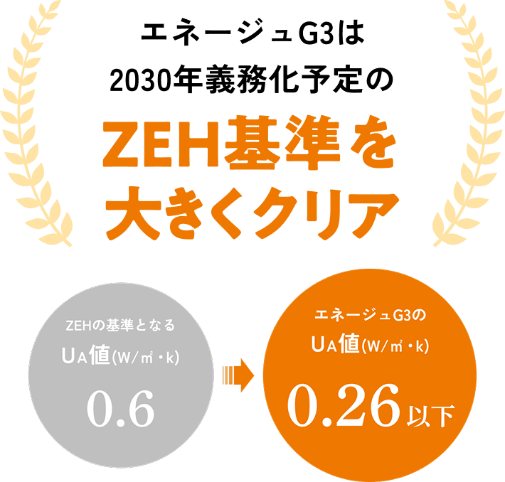 2030年に義務化予定の断熱等級5(住宅性能表示制度・断熱等性能等級)のUA値0.6を大きくクリアしており、エネージュG3の優れた断熱性能を証明しています。