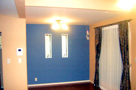 壁の一面にはご家族で考えぬいた、鮮やかなブルーのアクセントクロスを採用。