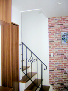 ▲玄関から2階へと続く階段には、ほどよい重厚感のあるアイアン手すりを採用。