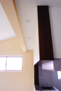 ▲構造上、大きくしなければならなかったキッチン側の梁は、下がり壁を活かした間接照明に。