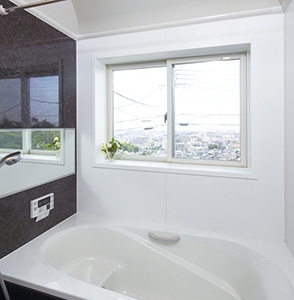 眺望の良い南側に浴室を配置しました。高台で人目が気にならないので、大きな窓を付けてもらいました。開放感があって気持ちが良く、ついつい時間を忘れますね。