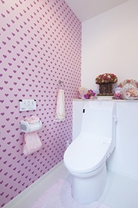 ▲1階トイレのハート柄のクロスは奥様が、それぞれ選びました