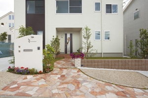▲ゆるい曲線を描く乱形石でつくられた明るいアプローチには、季節の花々が彩りを添えます。