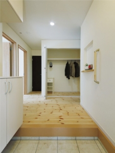 ▲大きな荷物もすっきり収まるホール右側のシューズクロークは、水道付きの外部デッキから直接出入りできるようプランニング