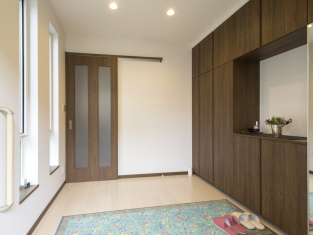 構造上、吹き抜けをつくることが難しかったため、玄関は高天井にして頂きました。