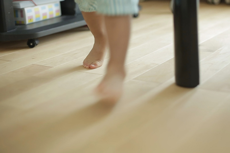 ▲優しい感触の無垢材の床は裸足で走りたくなるような気持ちよさ。お子様にもお喜びいただいている。