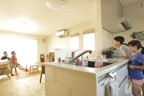 ▲対面キッチンはお料理中でもリビングでくつろぐご家族との会話が弾みます。コンロ前に壁をつけてお掃除も楽に。
